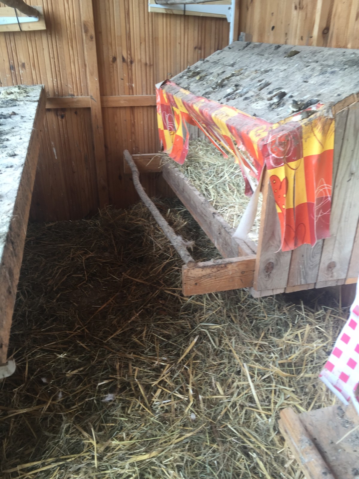 Aus OSB Platten die ich von der Fussbodenerneuerung im Wohn und Esszimmer übrig hatte baute ich mit Dachlatten als Eckhölzer nochmal zwei Lege/Brutnester, die ich herausnehmen kann wenn eine Glucke brütet. Die Abflugstangen sind aus Rundstäben und werden gerne angenommen.